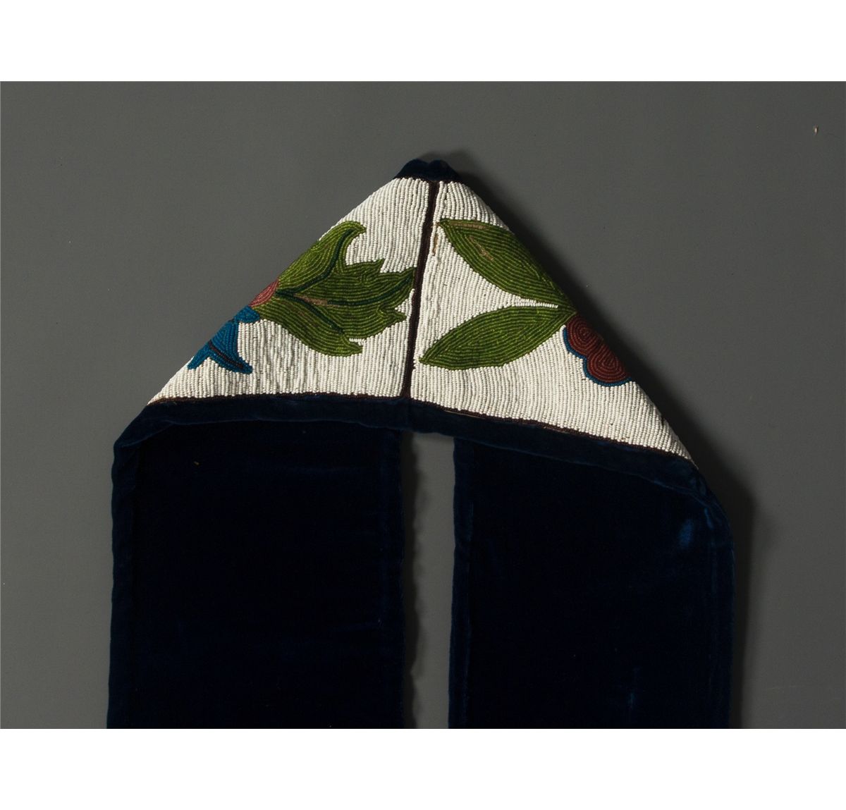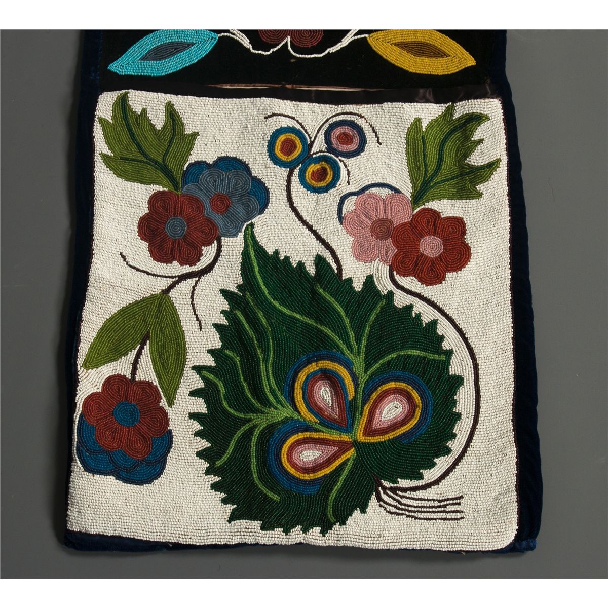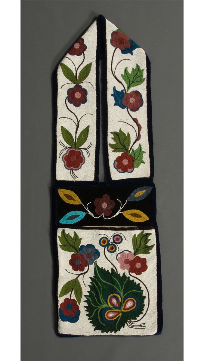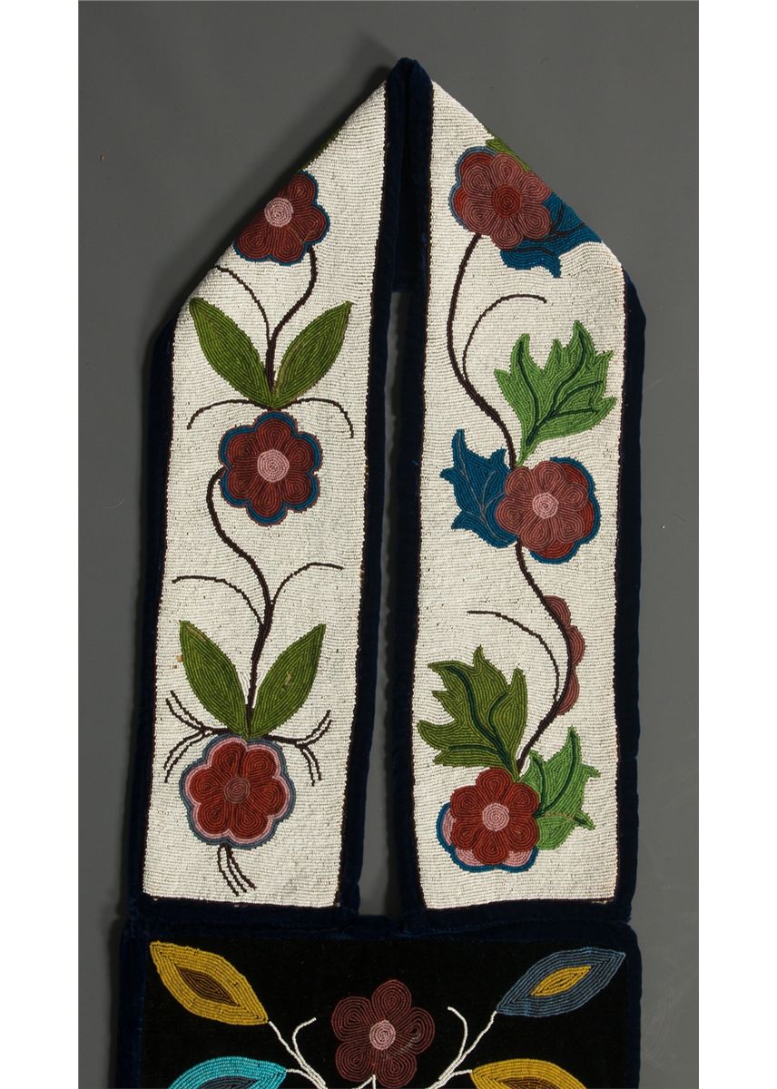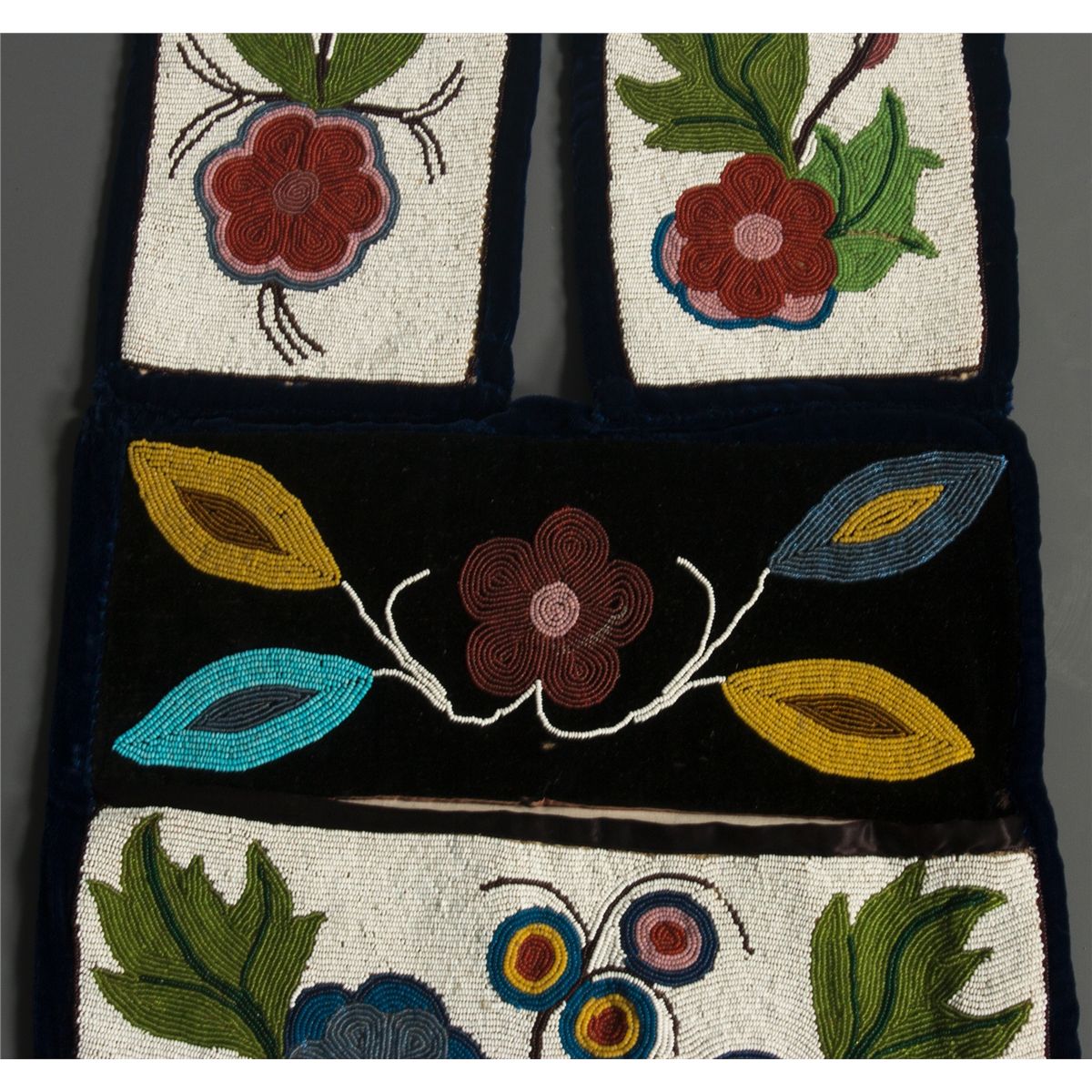 Bandolier Bag. 40" x 13". Fully beaded pocket and strap separated by a partially beaded middle section. All floral designs. Made by Sylvia Spotted Wolf. 20th century, in as new condition. Provenance: Indian River Gallery.