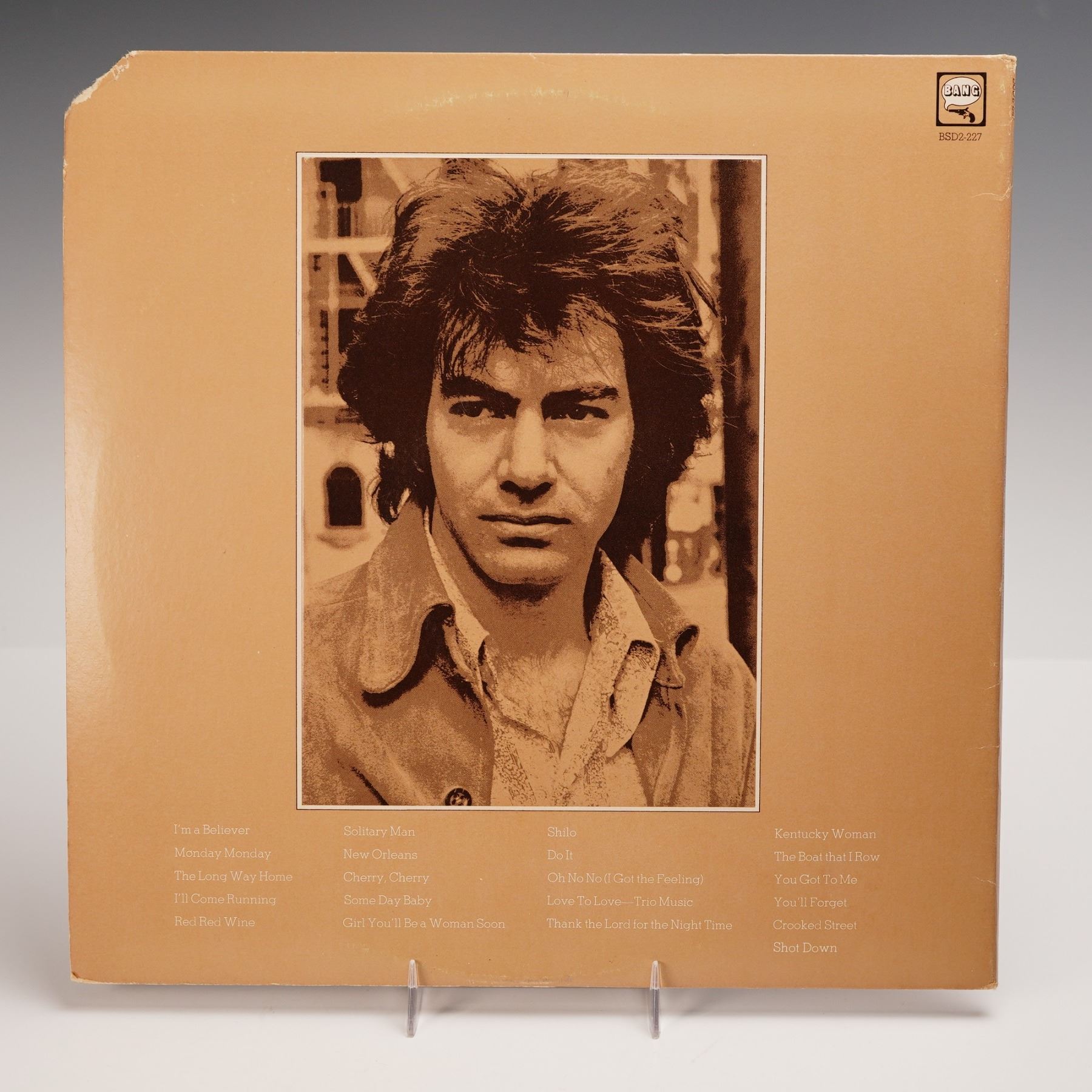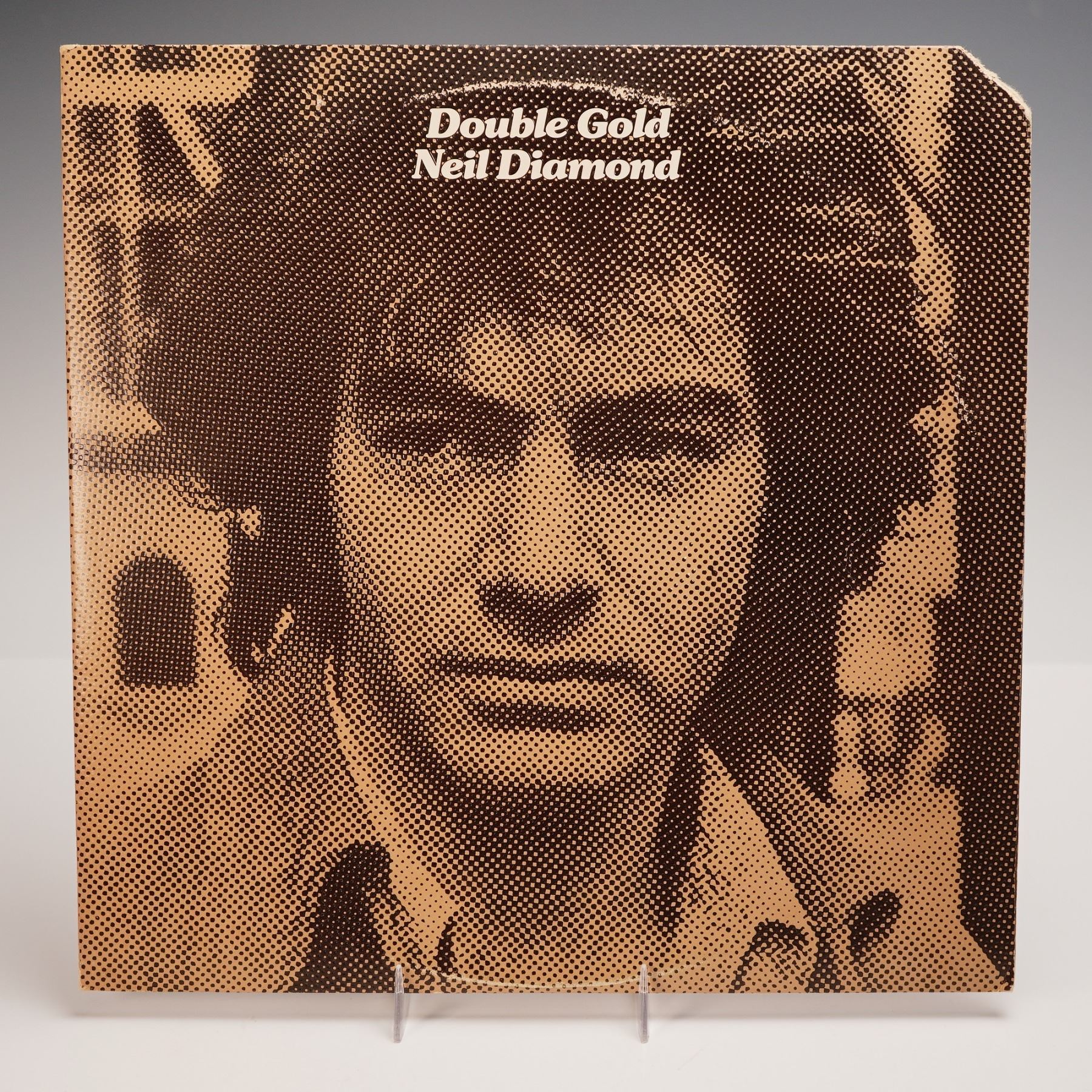 Early 1970s U.S. pressing of Double Gold by Neil Diamond, released by Bang Records. This double LP compilation is housed in a distinctive gatefold jacket featuring a halftone style close up portrait of the artist on the front and a sepia-toned photographic reproduction on the reverse, with a comprehensive list of included tracks. This anthology spans Diamond's prolific mid to late 1960s output with Bang Records, and includes classic selections such as "Solitary Man," "Cherry Cherry," "Girl, You'll Be a Woman Soon," "Red Red Wine," "Kentucky Woman," "Shilo," and "I'm a Believer." Bang Records labeled to reverse of the jacket.