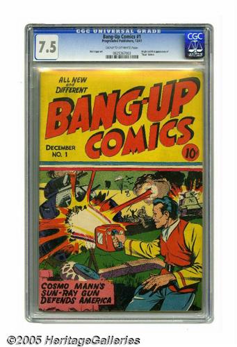 <B>Bang-Up Comics #1 (Progressive Publishers, 1941) CGC VF- 7.5 Cream to off-white pages.</B></I> One of the more esoteric titles in our sale, this first of just three issues featured the origin and first appearance of "Buzz" Balmer. Cosmo Mann and Lady Fairplay stories are included. This issue is a Gerber "scarce," and CGC has certified just three copies to date. Overstreet 2005 VF 8.0 value = $625. CGC census 6/05: 1 in 7.5, 2 higher.