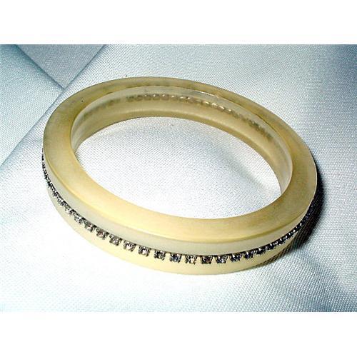 A stunning off-white clear lucite bangleembellished around the centre with small prong set multi faceted clear rhinestones. Excellent condition, no missing stones. Will fit any average size wrist, inside diameter of 2-3/4" and height is 1/2".