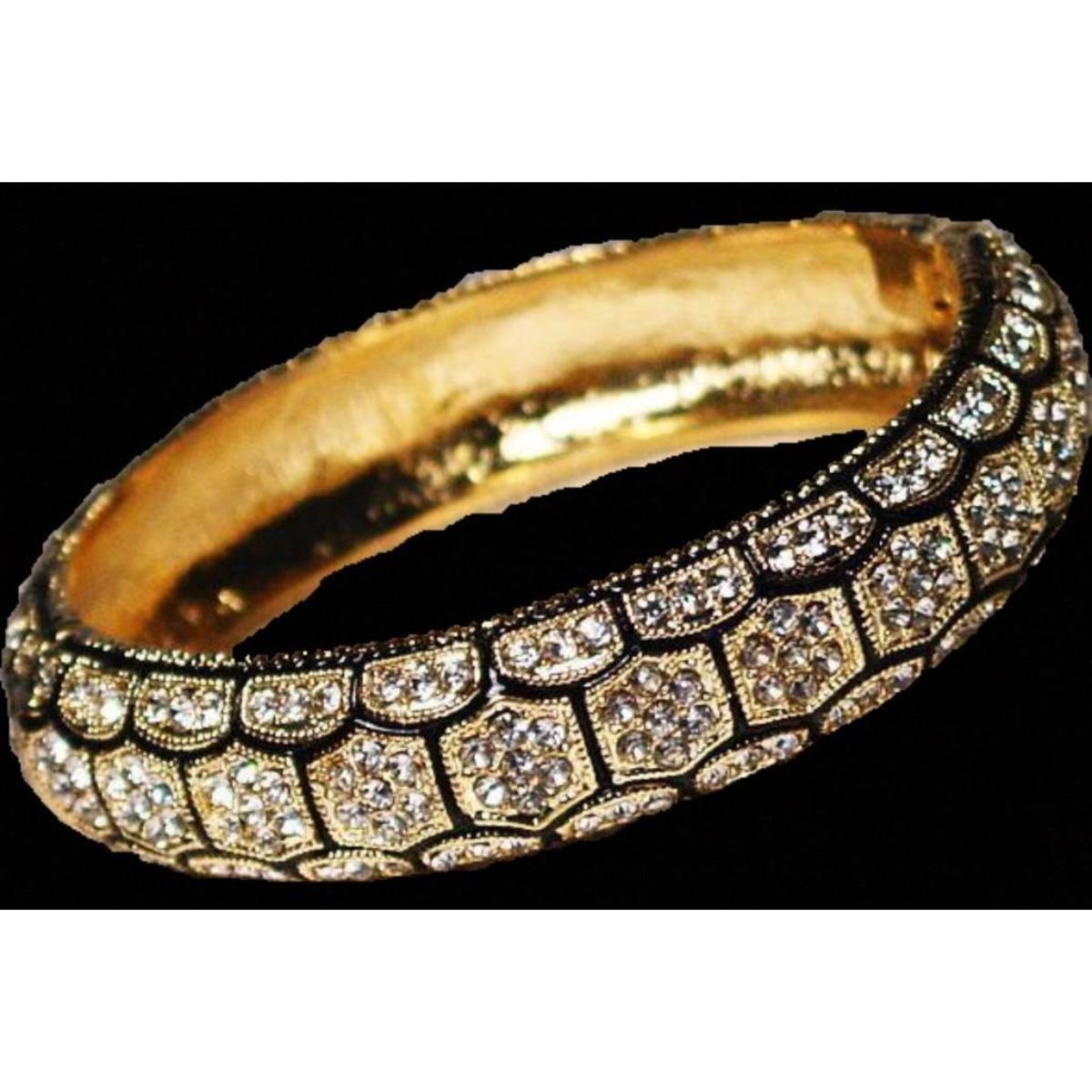 Upscale Designer Jewelry (Costume) This Honeycomb Hinged Bracelet is paved with hundreds of Clear Crystals and would great on your wrist! Brand New 318 Round Clear Crystals Honeycomb Design Black Enamel Gold Plated Accents 5/8 inch wide 2 3/8 inches Inside Diameter Hinged Bracelet - 10070-040618-EB-84729