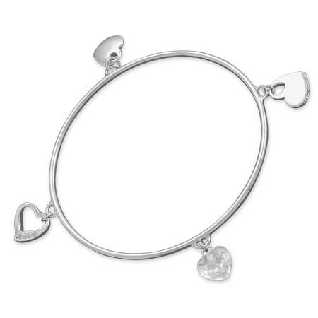 Sterling silver slip on bangle bracelet with polished, faceted crystal and CZ heart charms. Heart charms are approximately 10mm - 12mm. .925 Sterling Silver