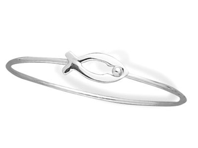 1.5mm wide bangle. Ichthys design measures 9.5x20mm and doubles as a hook closure. .925 Sterling Silver
