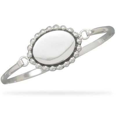 Bangle is 3.5mm wide with 23x30mm engravable tag and hook clasp. .925 Sterling Silver