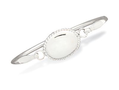Bangle is 3mm wide with 19x27mm engravable plate and hook clasp. .925 Sterling Silver