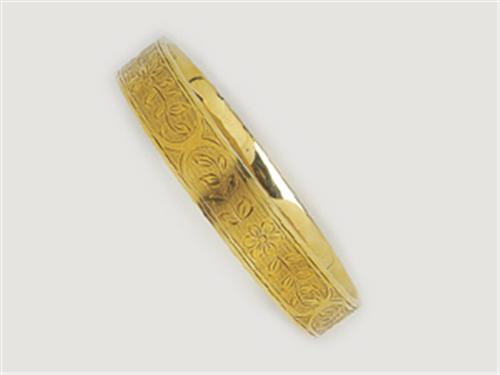 14 K gold, hoop form, floral motif engraved by hand, Pest, circa 1930, marked, weight: 20.4 g, damaged.