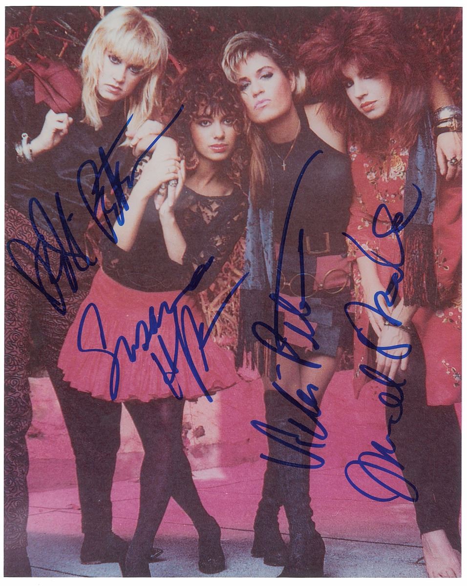 Desirable color glossy 8 x 10 photo of the Bangles, signed in person in blue felt tip by Susanna Hoffs, Debbi Peterson, Vicki Peterson, and Michael Steele. In fine condition, with a slightly grainy quality to the image. An excellent fully signed photo of these trendsetting pop-rockers.
