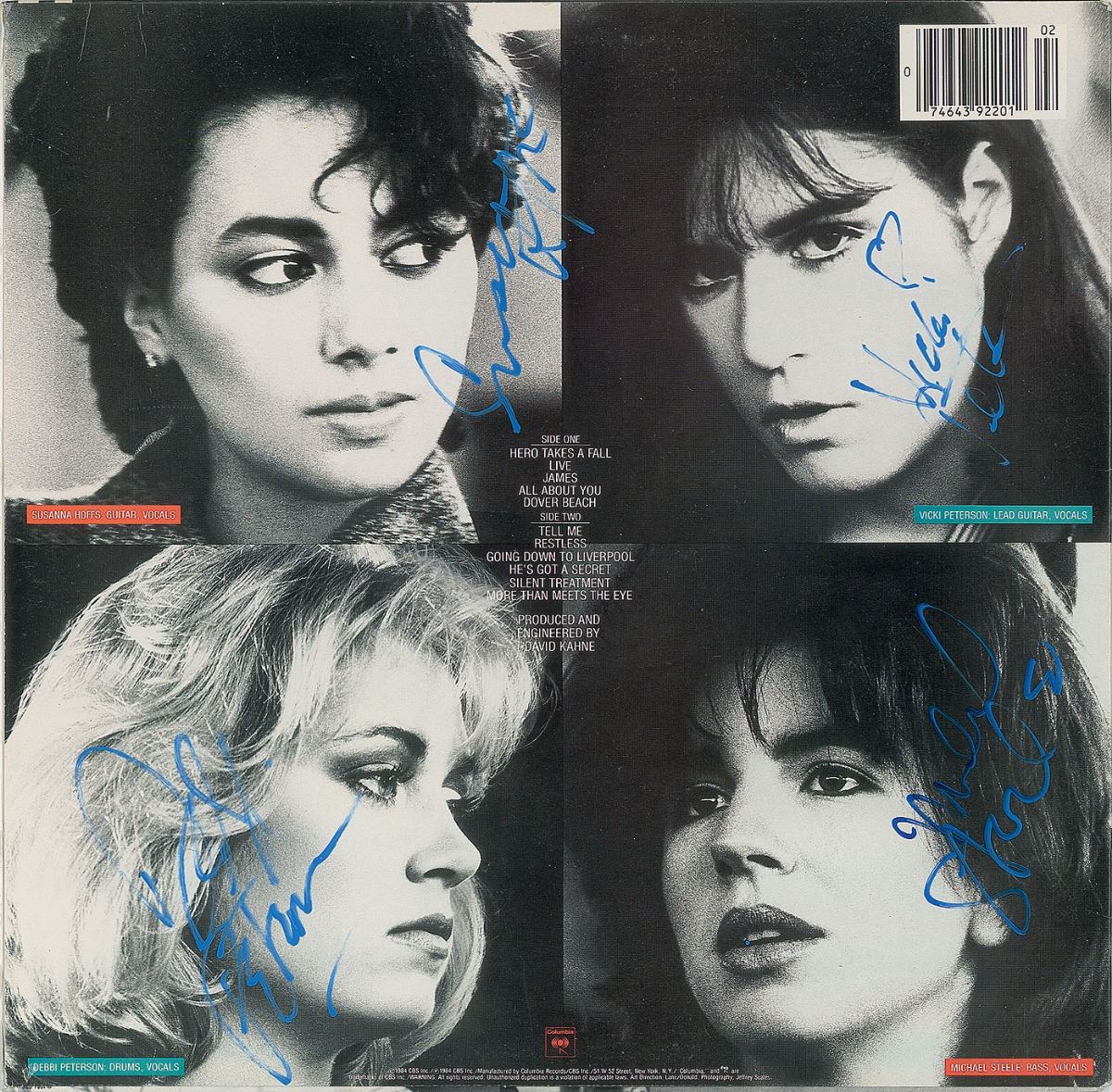 All Over the Place album boldly signed on the back cover in blue paint pen by Susanna Hoffs, Vicki Peterson, Debbi Peterson, and Michael Steele. In fine condition. The record is included. Consignor notes that the signatures were obtained prior to a show at Ohio’s Blossom Music Center.