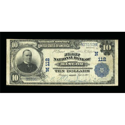 <B>Bangor, ME</B></I> - $10 1902 Plain Back Fr. 624 <B>The First NB</B></I> Ch. # (N)112<BR> Not quite as nice as the $5 Brown Back above, but likely to cost considerably less. Pleasing <B>Fine+.</B></I><BR><BR><b>Shipping:</b> Coins & Currency (<a target="_blank" href="http://www.heritageauctions.com/common/shipping.php">view shipping information</a>)