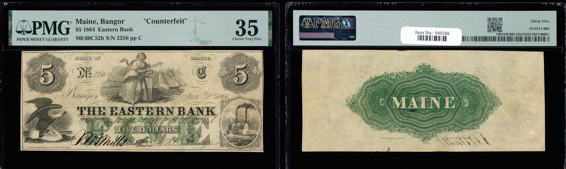 Bangor, Maine - Eastern Bank $5 Jan. 2, 1864 C52h Counterfeit PMG Choice Very Fine 35 (Haxby-C52h),