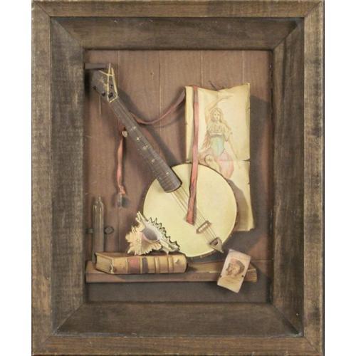 This is a very intriguing shadow box that is in very good condition. This three dimensional style of art is very attractive and eye-catching. The compositional layout of this shadow box is both creative and well planned. Its design convinces the viewer of its reality and gives a sense of tangibility. This picture is excellently framed in a rustic brown wood frame that matches the subject matter and measures, 10.75?? x 8.75?. This is a very unique picture at a great price.