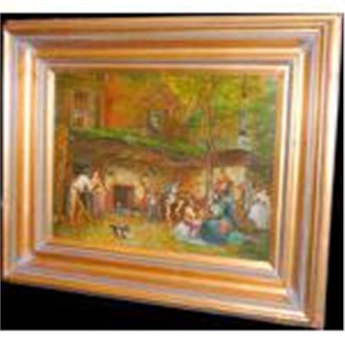 Very interesting compostion of a gathering with variety of interests. Beautiful shading and detailing. Signed by R. Neilson. A beautifully detailed oil painting by a contemporary artist. Handsome handcrafted frame with wonderful details. Dimensions are of the painting. 12x16 Framed oil on board - $395. 24x30 Framed oil on canvas - $895.