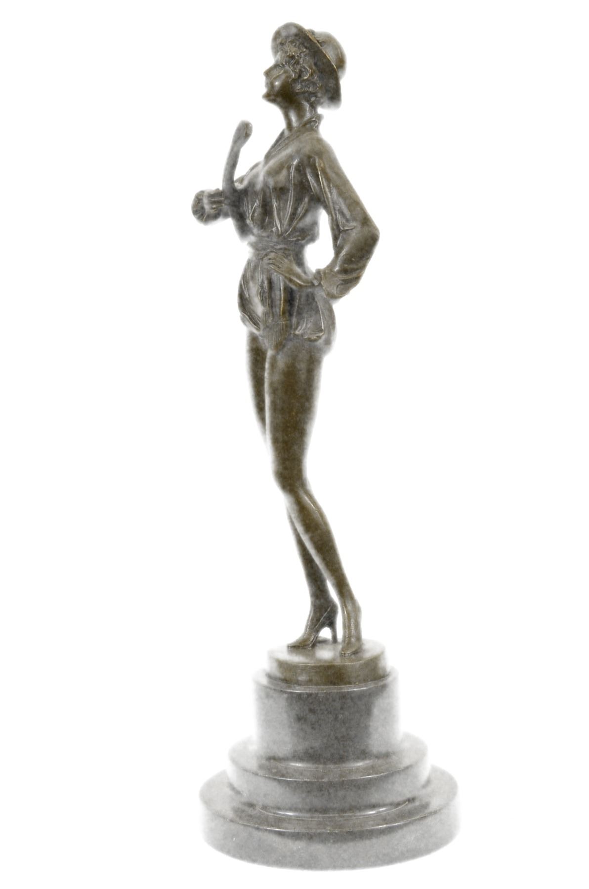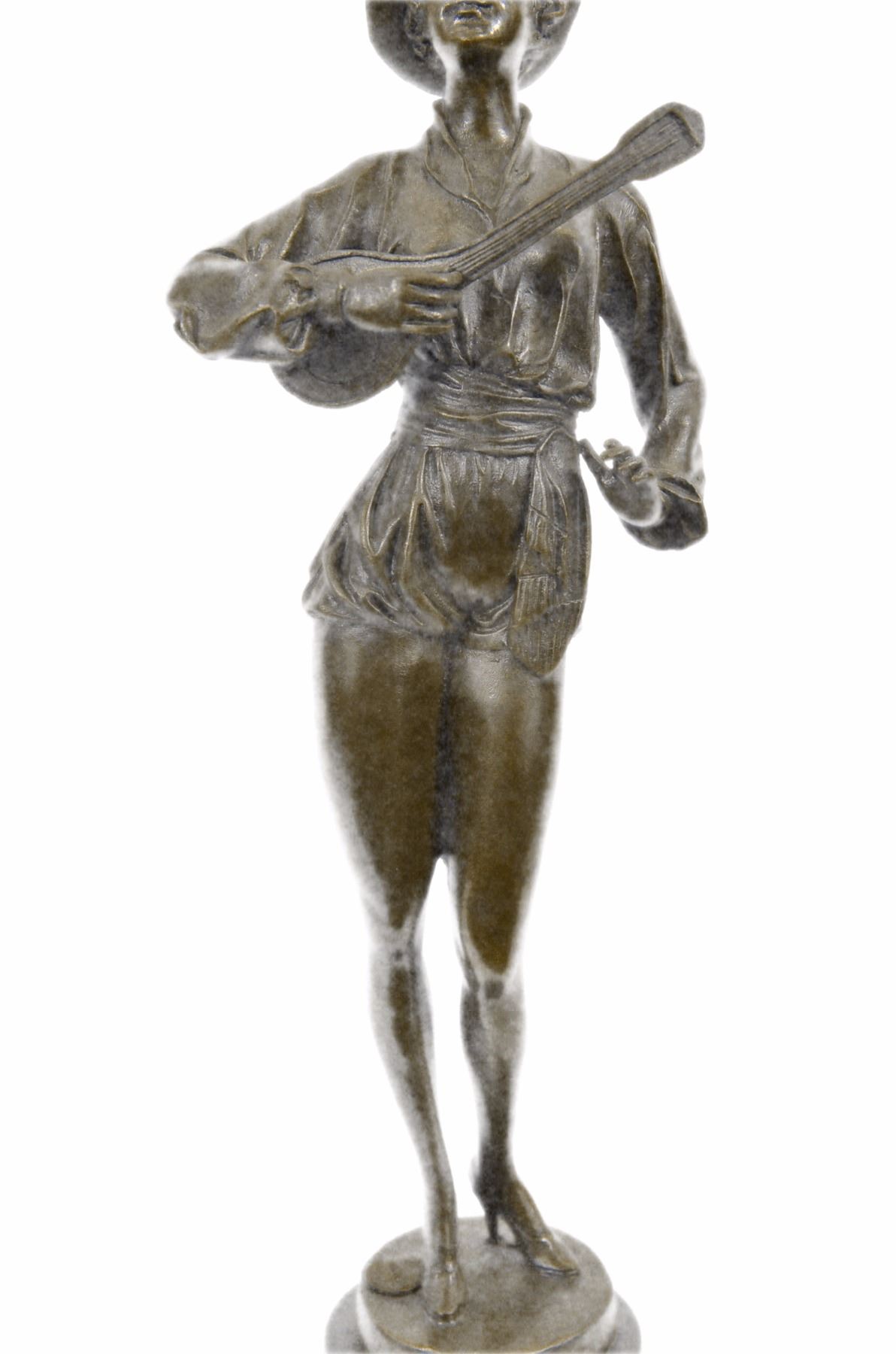 She Stands Center Stage With Her Hand Perched High On Her Hip And Tucks Her Guitar Under The Crook Of Her Arm. She Tilts Her Head Up Slightly With Pride. She Is Dressed In Thigh High Shorts, A Loose Fitting Blouse That Is Belted With A Sash Around Her Curvy Waist And High Heels. A Hat Sits Slanted On Her Short Curly Head. This Brown Patina Sculpture Was Cast Using The Lost Wax Method And Mounted On A Marble Base. Bronze dimensions with marble base: Height 16 X Width 5 inches. Weight: 9 lbs.Please Note: This is a reproduction bronze sculpture from the original molded and signed. This featured bronze sculpture is a recast after the original, and has been done recently. This 100% bronze sculpture is an abstract piece certain to be a conversation piece.Please Note: This is a reproduction bronze sculpture from the original molded and signed. This featured bronze sculpture is a recast after the original, and has been done recently. This 100% bronze sculpture is an abstract piece certain to be a conversation piece.