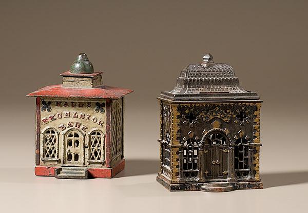 American, late 19th century. One bank building is a white and red mechanical, name over door, Hall's Excelsior Bank; 5.5" high x 4" wide. Other bank is a still roof bank by J.& E. Stevens Company of Cromwell, Connecticut; 5.25" high x 3.75" wide.