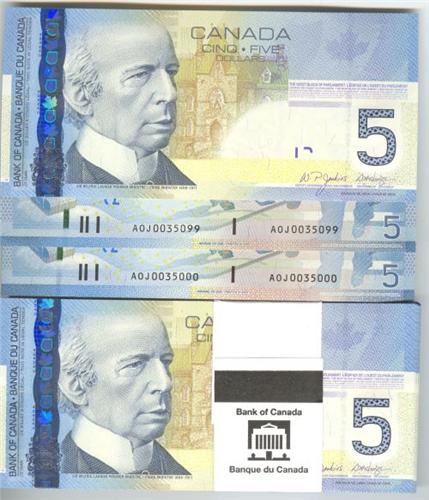 Bank of Canada $5.00 note 2006 in Uncirculated, BC-67a, Jenkins Dodge, AOJ0035000 to AOJ0035099. First few and last are AU. 100 consecutives new $5.00 with security strip. Possibly lowest number around too.