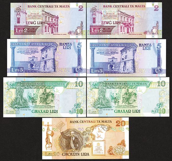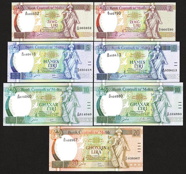 Malta. 2, 5, 10, 20 Liri. SCWPM 45a, d, 46a, d, 47a, c, 48a. Malta standing with rudder at right. The first with low serial # 0000790. All very Choice Uncirculated or better. 7 pieces. (Arthur C. Matz Collection)