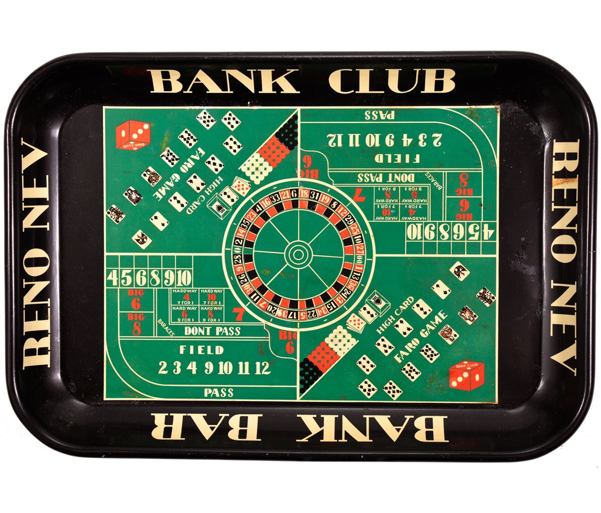 A 15" x 10.5" metal serving tray depicting roulette, craps, and a faro layout from the Bank Club. Opened in 1931, the Bank Club was Reno's largest casino from the 1930s-1940s. In 1952 it merged with the Golden Hotel and became the Golden Bank Club. - Jacobitz Collection -59527