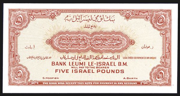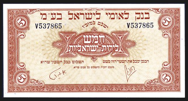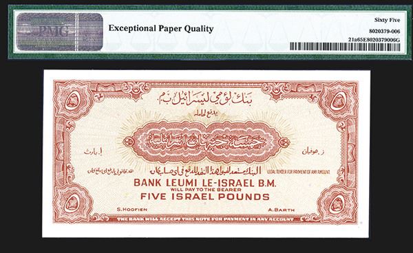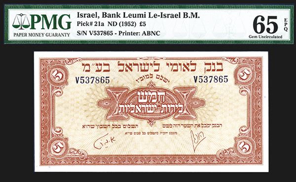 Israel, £5, P-21a, Issued banknote, Brown on yellow underprint, PMG graded Gem Uncirculated 65 EPQ. Attractive note rarely seen this nice. ABNC (Without imprint)