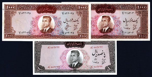 Iran, lot of 3 issued notes, includes 500 Rials, ND (1965), P-82, AU; 1000 Rials, SH1341 (1962), P-75, XF with minor ink graffiti on to left corner of obverse; and 1000 Rials, ND (1965), P-83, Choice VF.