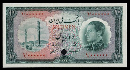 Iran, ND (1954) / SH1333, 10 Rials, P-64cts, Unlisted Color Trial, Green on light red and m/c instead of issued dark blue on m/c, S/N 1/000000 - 40, Specimen overprint, POC, Yellow security thread, PMG graded Gem Uncirculated 66 EPQ (Exceptional Paper Quality), Printer: Harrison without imprint. Rare, attractive and exceptional condition color trial.
