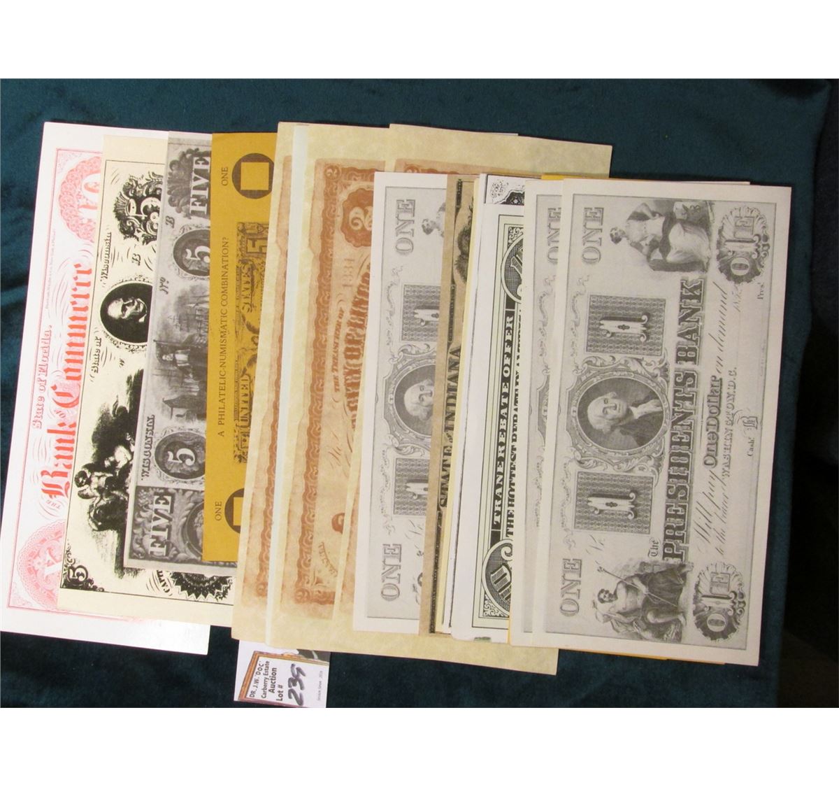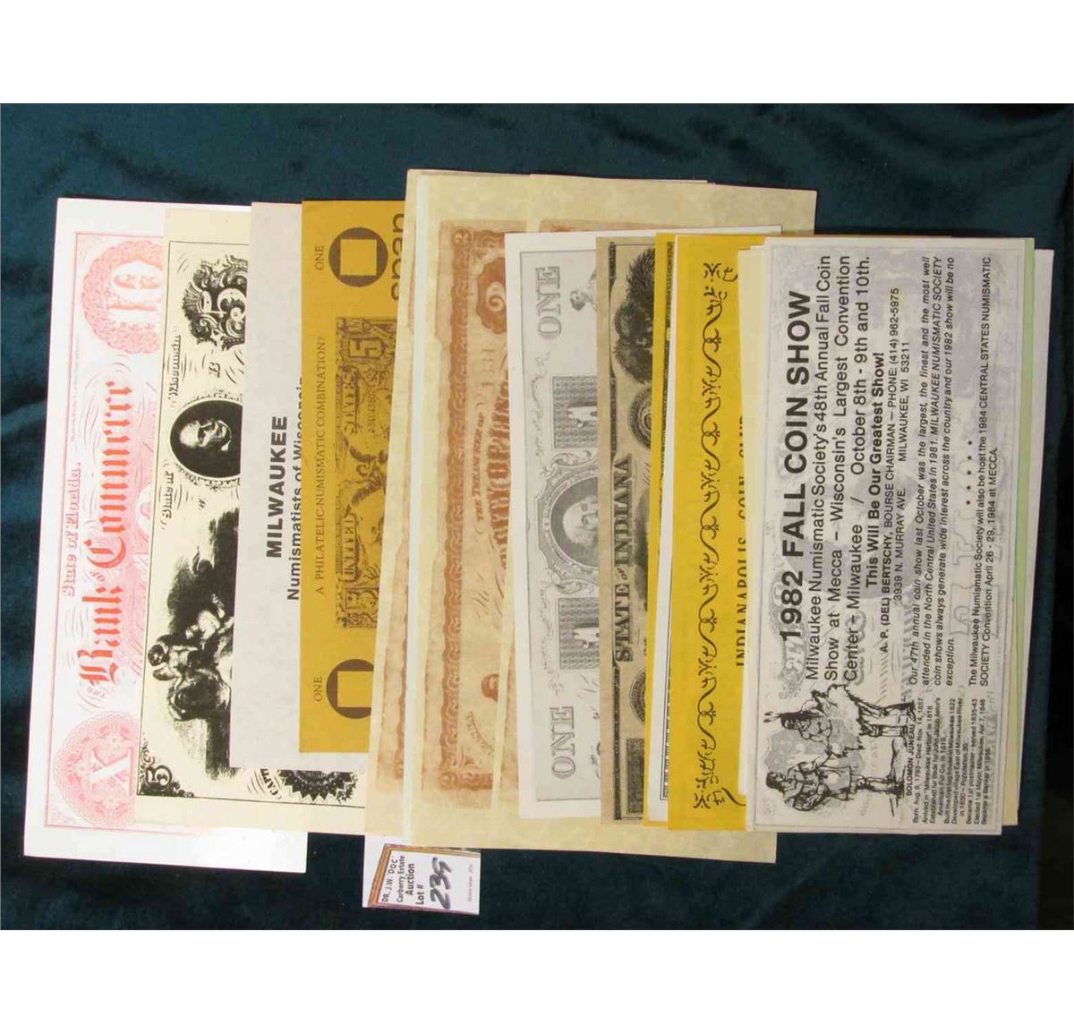 "Bank Note Reporter One Ad Buck"; "Riley Sweers Company's United Profit-Sharing Coupon", New York, N.Y.; (2) "C.S.N.S. April 17-20, 1980…Lincoln, Nebraska" facsimile of "The City of Lincoln Two Dollars" bank note; 1971 A.N.A. Washington, D.C. facsimile of 1852 One Dollar "The Presidents Bank...Washington, D.C." Bank note; 1981 Indianapolis, Ind. C.S.N.S. facsimile of $3 State of Indiana Exchange Banking House note; 1973 Indianapolis Coin Club facsimile of the $3 State of Indiana Exchange Banking House note; 1978 "Vote O'Donnell for ANA VEEP Note; & (13) Other Similar Items.