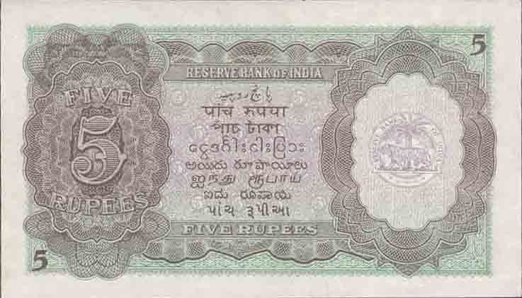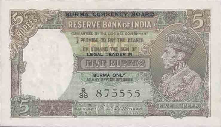 King George VI,1938, 5 Rupees, Burma Currency Board,signed by C.D. Deshmukh,RPrefix,serialno in black, S.No. R36 875555,(KJ RR # 5.14.1),UNC, excellent paper quality,Rare.Side facing profile of King George VI with semi fancy number.