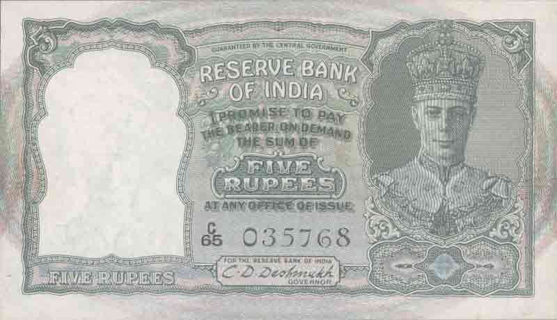 Bank Note of Five Rupees of King George VI signed by C D Deshmukh.
