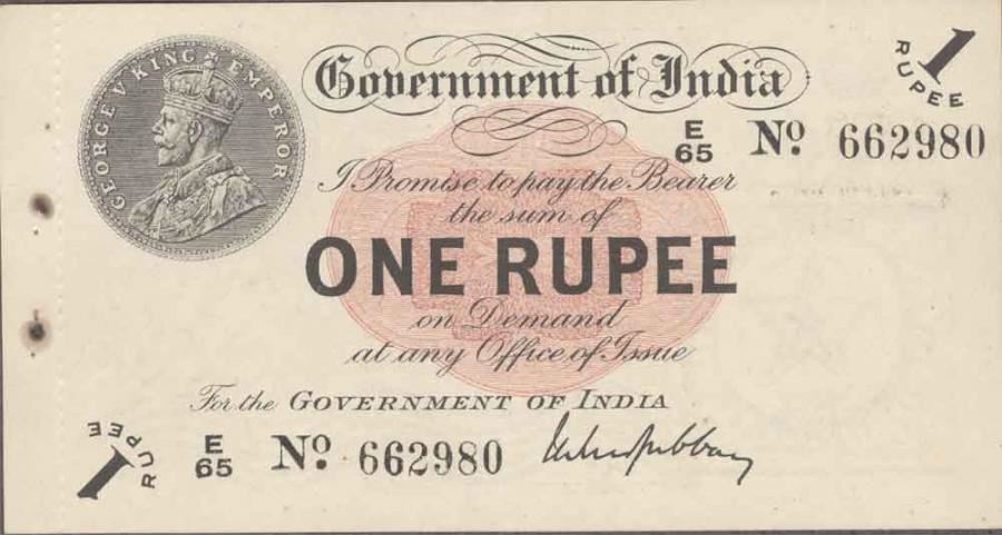Bank Note of One Rupee of King George V signed by M.M.S.Gubbay.