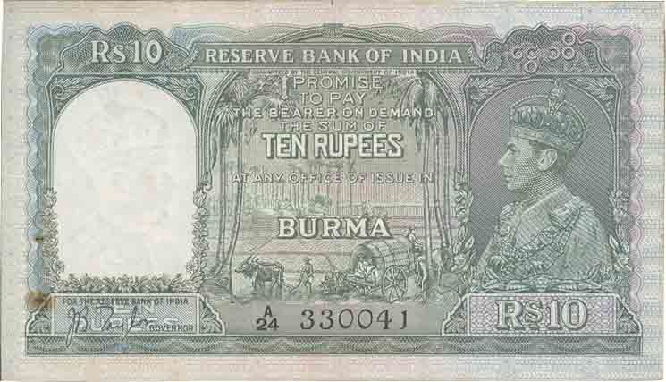 King George VI,1938, 10 Rupees,Burma Issue,signed by J.B. Taylor,APrefix,serialno in black, S.No. A24 33041,(KJ RR # 5.5.1),almost UNC, Scarce.