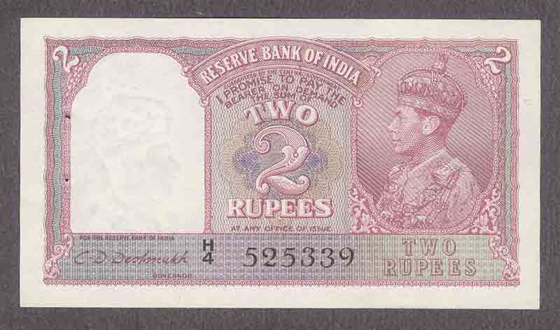 King George VI,1943, 2 Rupees,signed by C.D. Deshmukh,HPrefix,serialno in black, S.No. H4 525339,(KJ RR # 4.2.2),UNC.