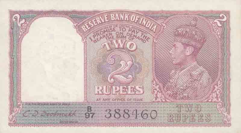 King George VI,1943, 2 Rupees,signed by C.D. Deshmukh,BPrefix,serialno in black, S.No. B97 388460,(KJ RR # 4.2.2),UNC.