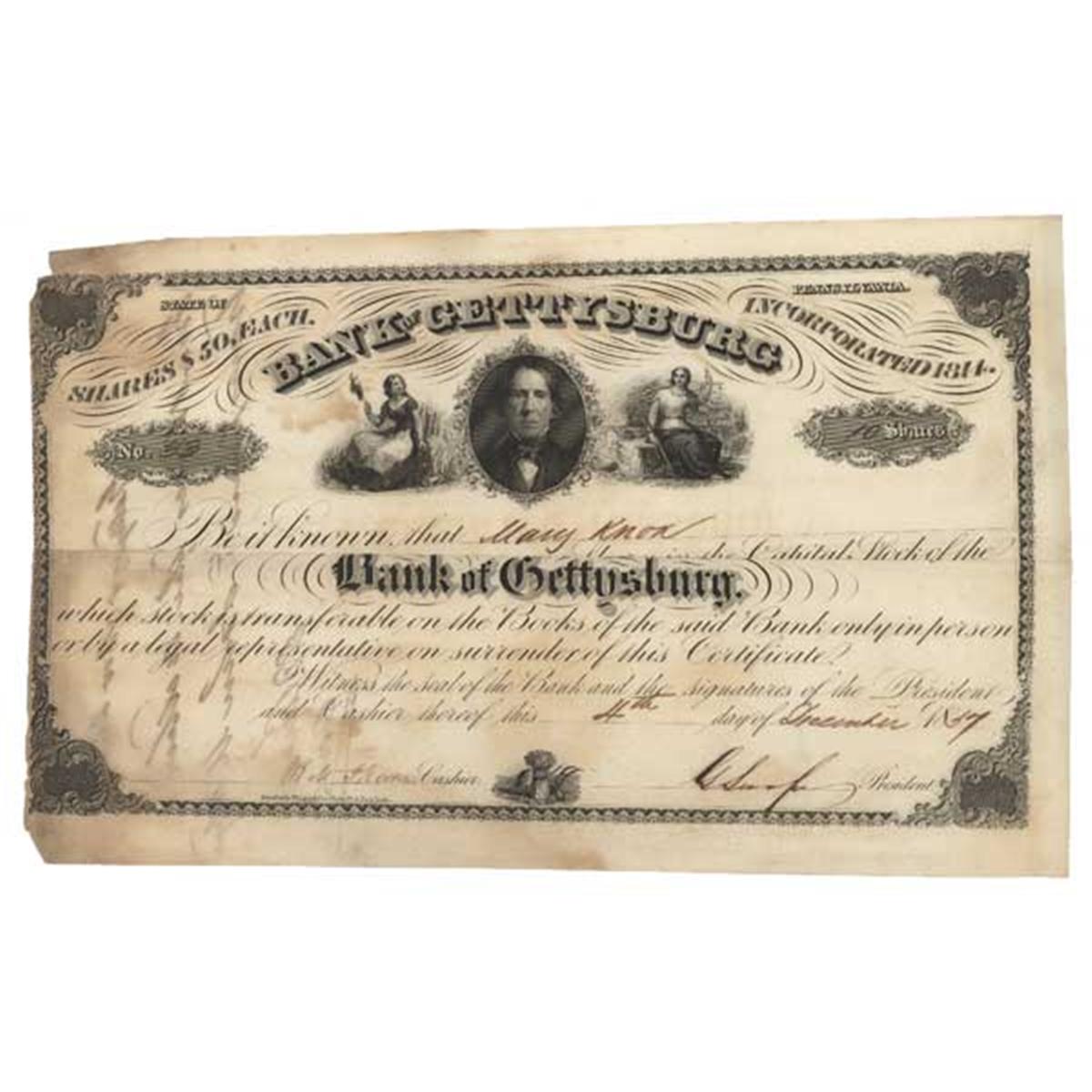 1858, Pennsylvania. Stock certificate for 6 share. Engraved vignette of a male portrait flanked by seated liberty and commerce. A choice bank stock.Cut cancelled and Fine.