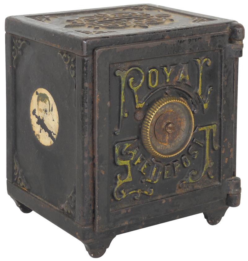 Bank, Royal Safe Deposit, cast iron w/combination lock, orig paint, c.1890's, VG cond, 6"H x 5.5"W.