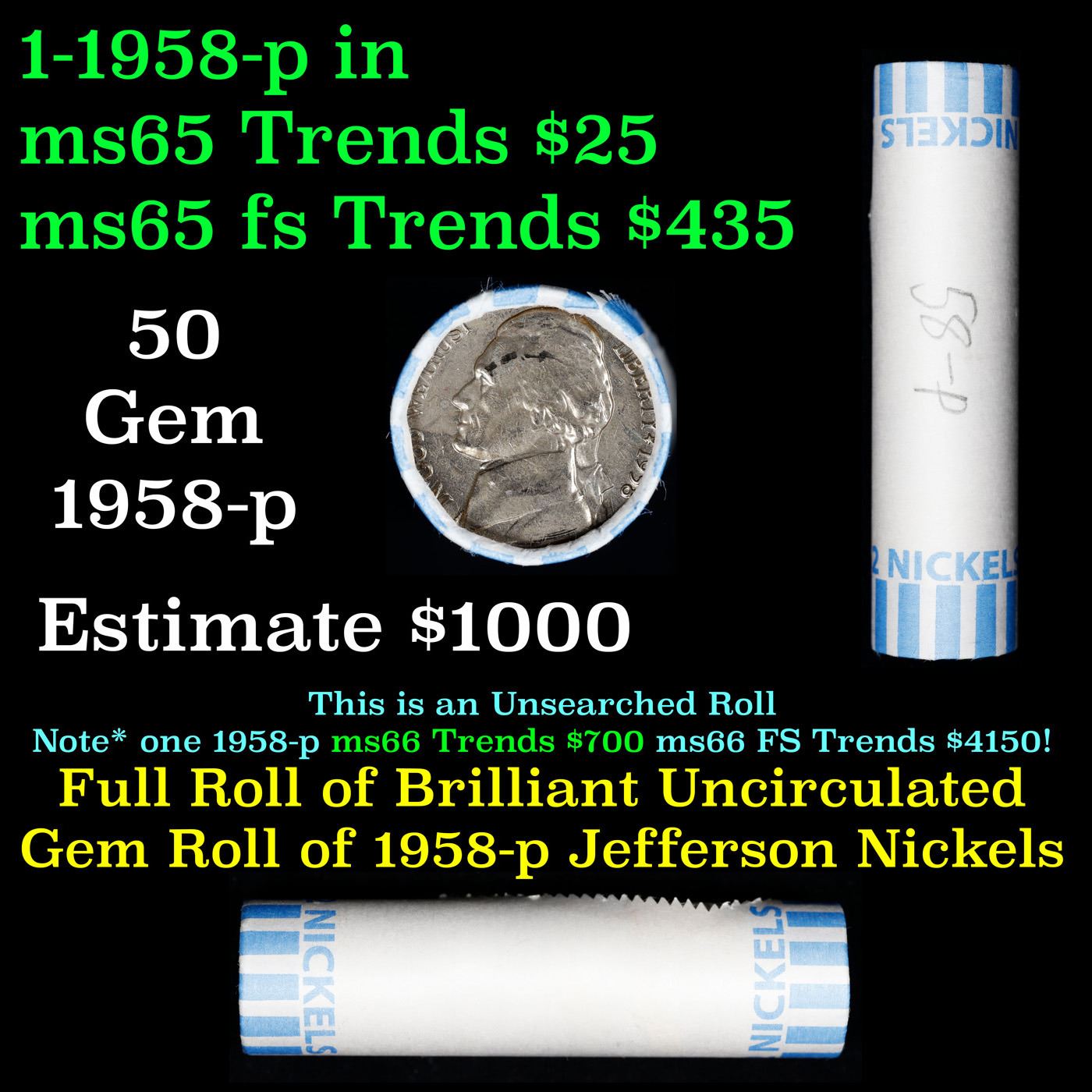 Bank Style Shotgun Uncirculated Jefferson 5c roll, 1958-p 40 pcs . A terrific Shotgun roll of unsearched uncirculated Jefferson nickels. Most if not all coins should be gem or better.