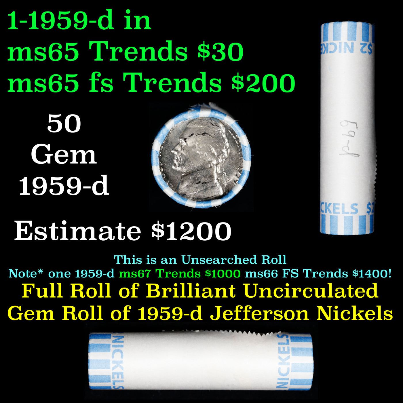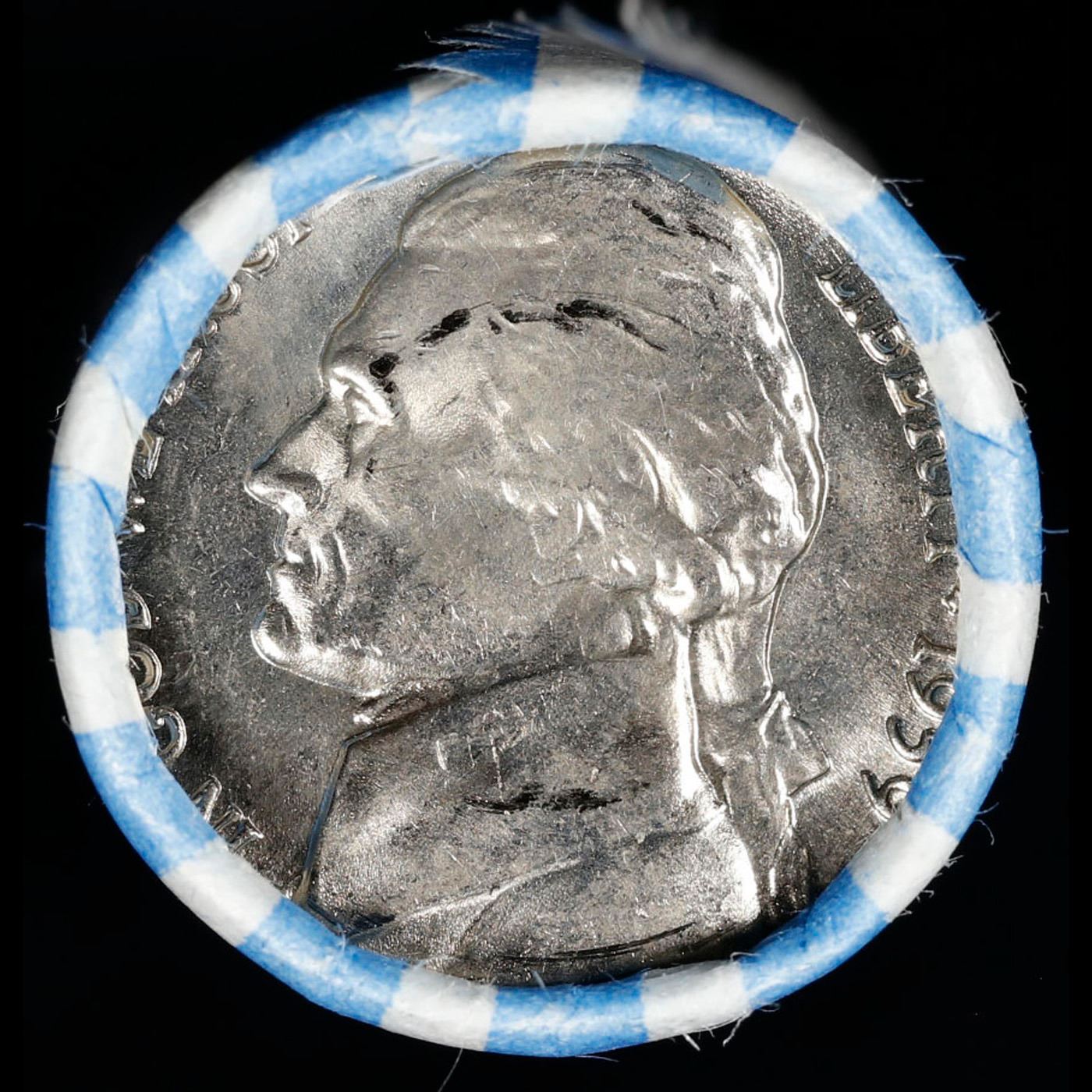 Bank Style Shotgun Uncirculated Jefferson 5c roll, 1959-d 40 pcs . A terrific Shotgun roll of unsearched uncirculated Jefferson nickels. Most if not all coins should be gem or better.