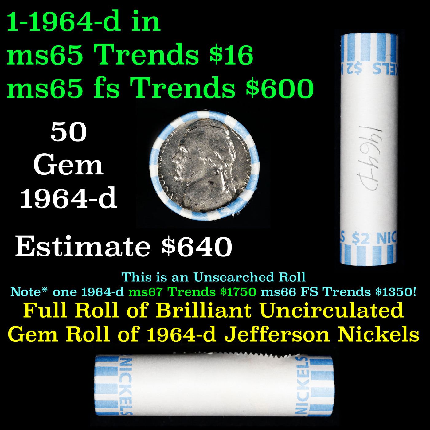 Bank Style Shotgun Uncirculated Jefferson 5c roll, 1964-d 40 pcs . A terrific Shotgun roll of unsearched uncirculated Jefferson nickels. Most if not all coins should be gem or better.