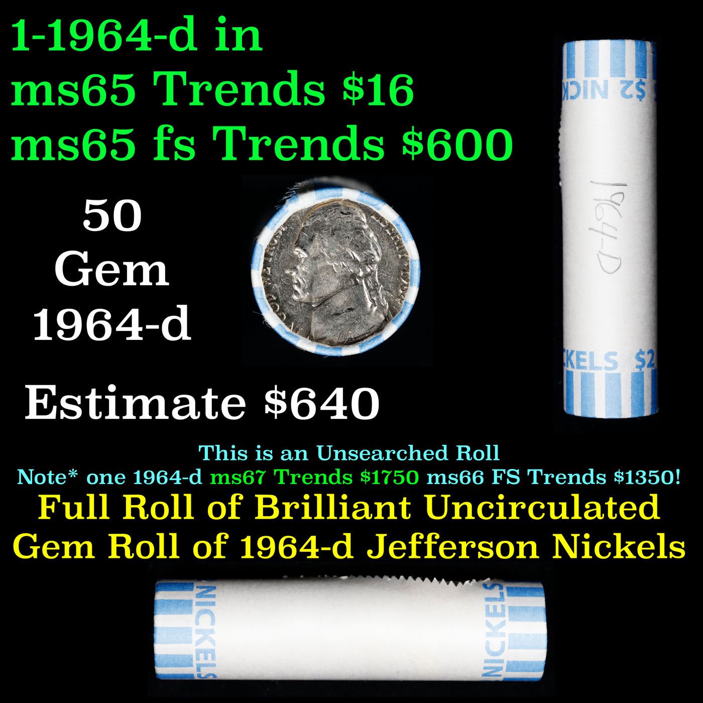 Bank Style Shotgun Uncirculated Jefferson 5c roll, 1964-d 40 pcs . A terrific Shotgun roll of unsearched uncirculated Jefferson nickels. Most if not all coins should be gem or better.