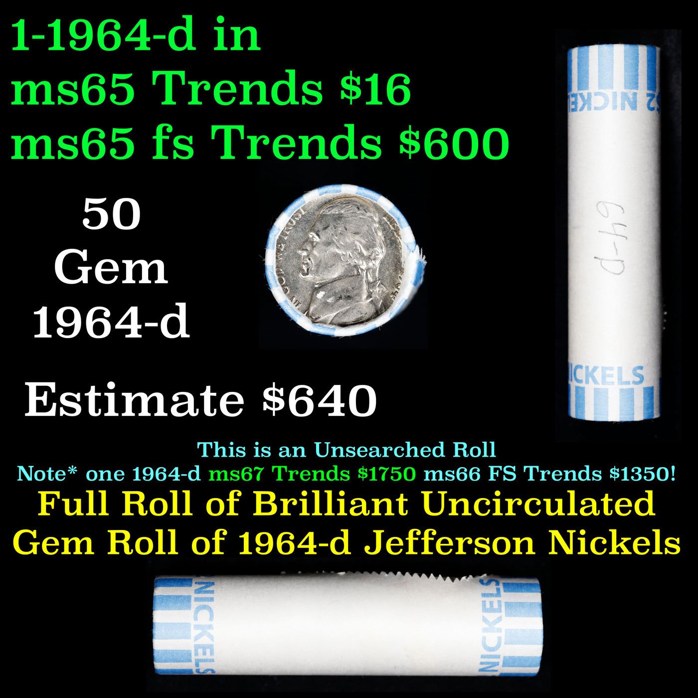 Bank Style Shotgun Uncirculated Jefferson 5c roll, 1964-p 40 pcs . A terrific Shotgun roll of unsearched uncirculated Jefferson nickels. Most if not all coins should be gem or better.