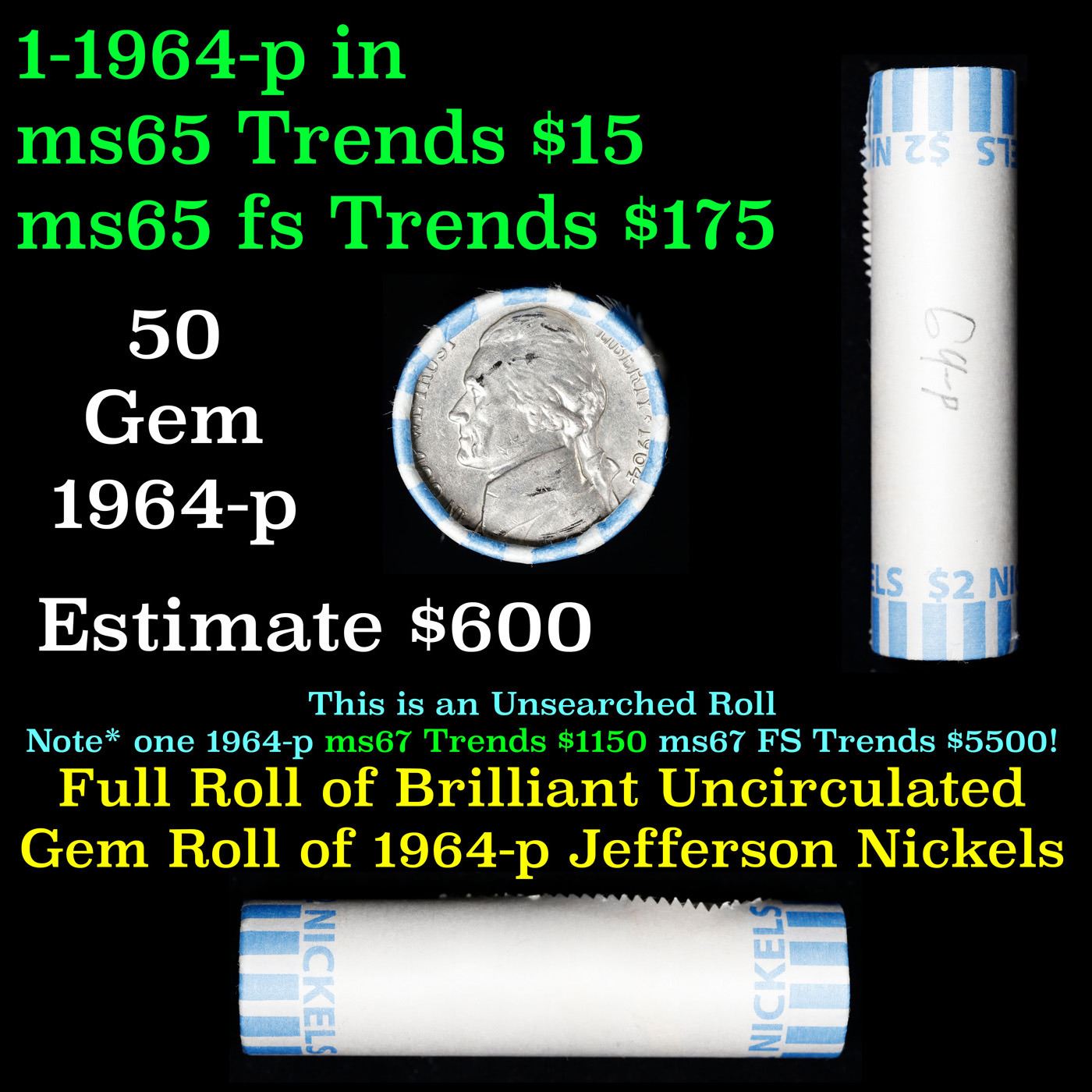 Bank Style Shotgun Uncirculated Jefferson 5c roll, 1964-p 40 pcs . A terrific Shotgun roll of unsearched uncirculated Jefferson nickels. Most if not all coins should be gem or better.