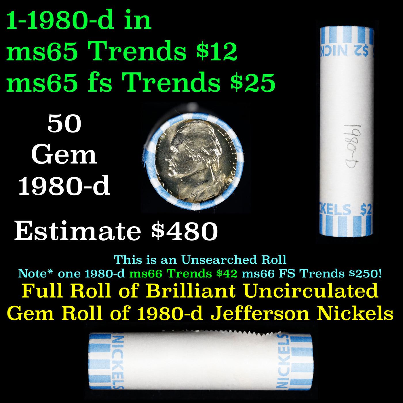 Bank Style Shotgun Uncirculated Jefferson 5c roll, 1980-d 40 pcs . A terrific Shotgun roll of unsearched uncirculated Jefferson nickels. Most if not all coins should be gem or better.