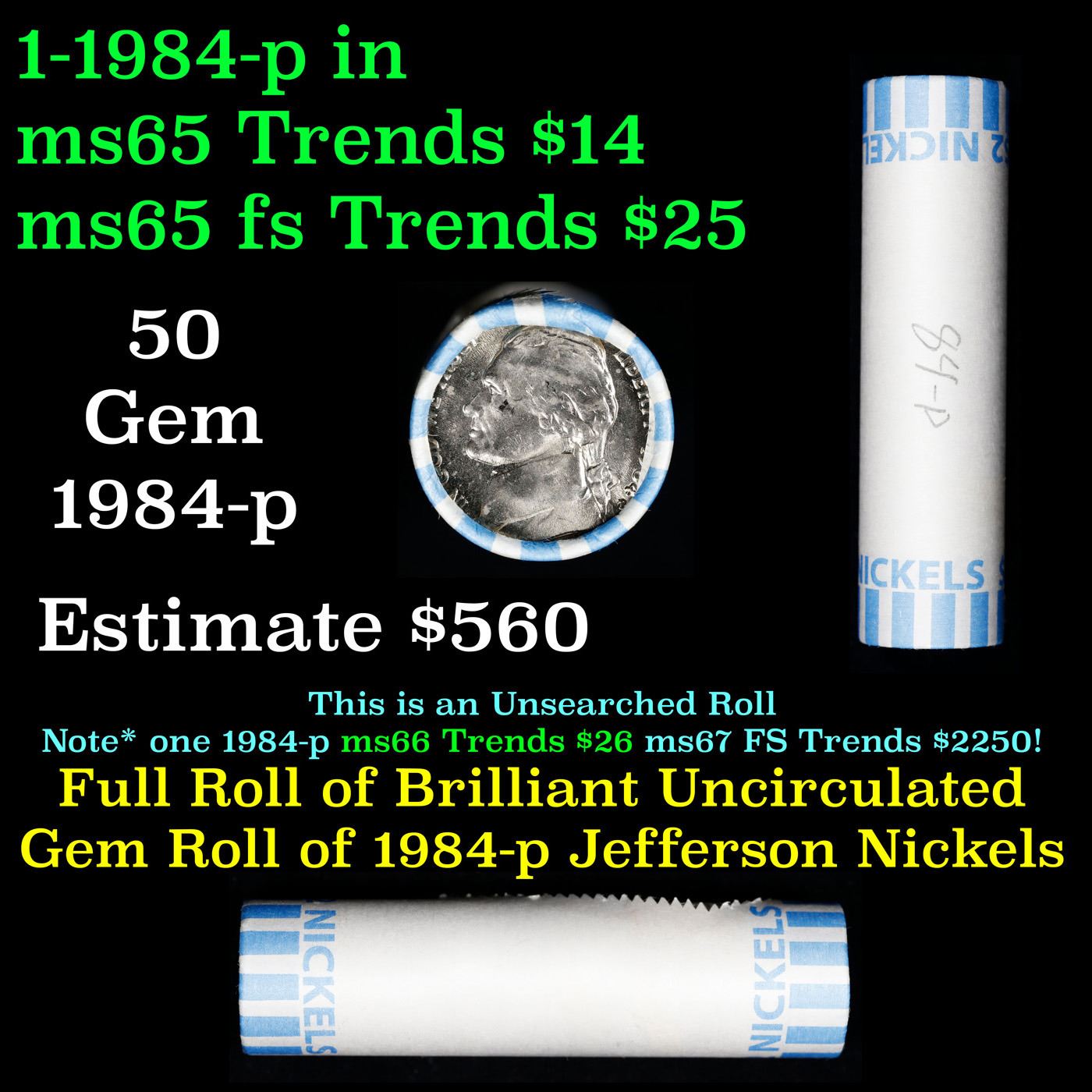 Bank Style Shotgun Uncirculated Jefferson 5c roll, 1984-p 40 pcs . A terrific Shotgun roll of unsearched uncirculated Jefferson nickels. Most if not all coins should be gem or better.