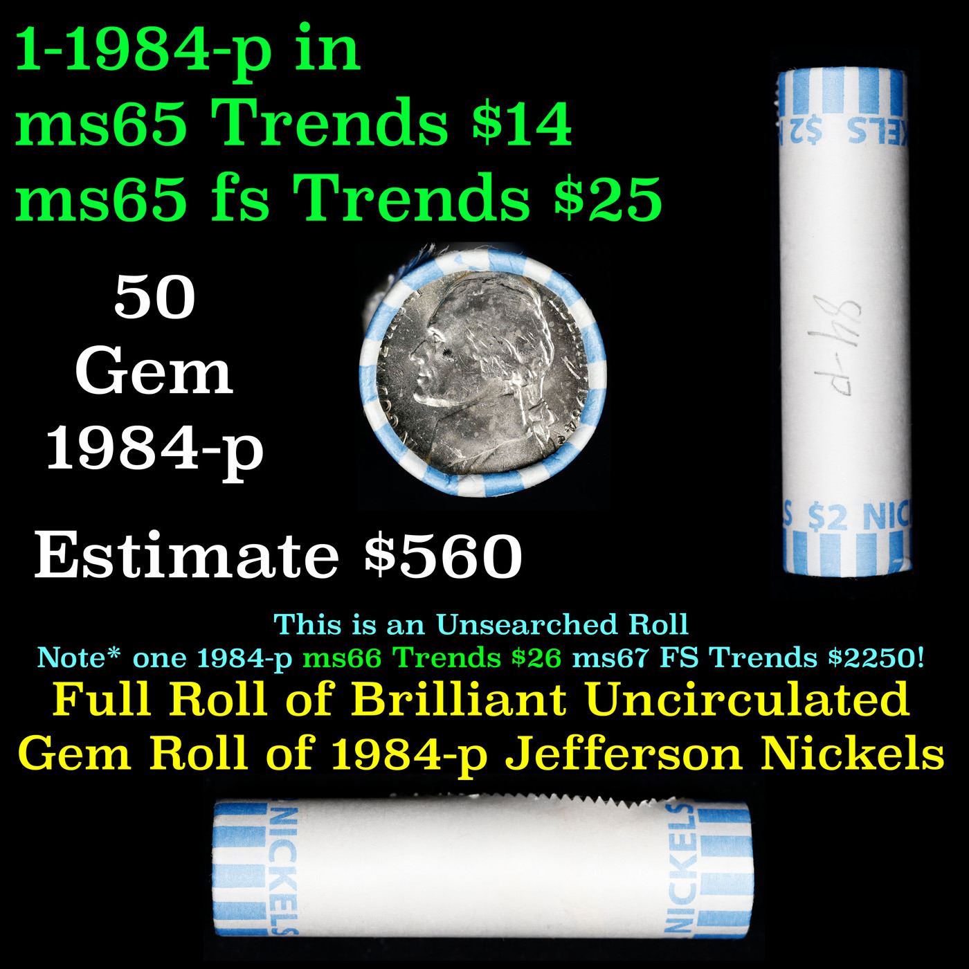 Bank Style Shotgun Uncirculated Jefferson 5c roll, 1984-p 40 pcs . A terrific Shotgun roll of unsearched uncirculated Jefferson nickels. Most if not all coins should be gem or better.