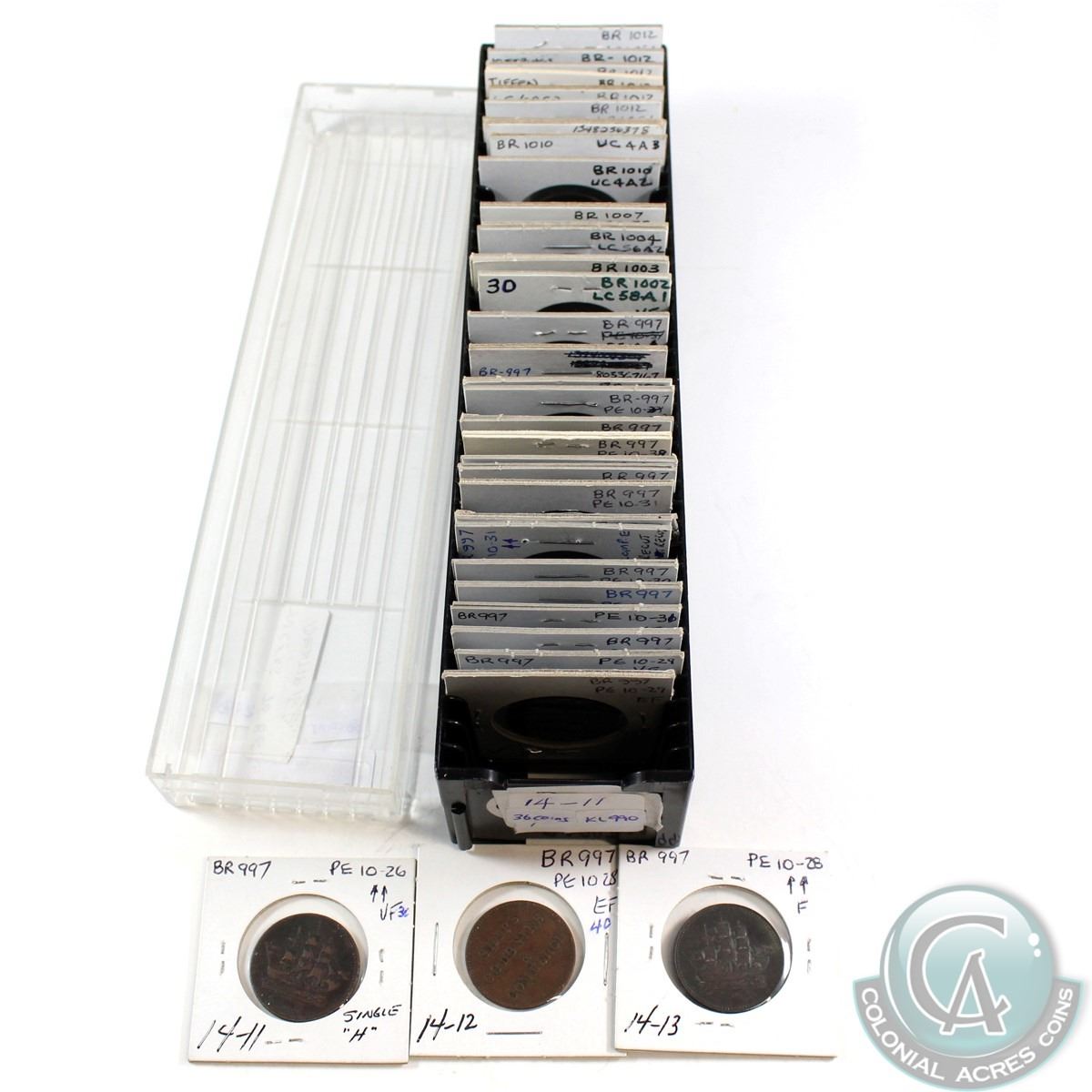Estate Lot of 36x Canadian Colonial Tokens of P.E.I (Ships & Colonies) , Lower & Upper Canada, & Wellington. Breton# 997-1012. Some better Grades and varieties present. Tokens are in original Holders from Collector and have been attributed, please note varieties do exist and information on holders may not be current and or accurate. Recommend viewing this lot. 36pcs.