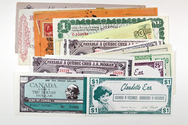 Canada. Bank Checks with 2c stamps. Issued/cancelled (9). Local notes - Includes Interpam '81, J.A. Moisan and Canadian Tire. Also include Western Lottery receipts and 1976 Olympic lottery tickets. 35 pieces total