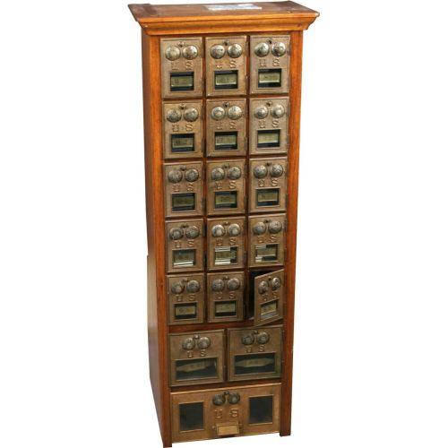 Bank of 18, Brass P.O. Boxes in Oak Cabinet 9 x 13 x 41"