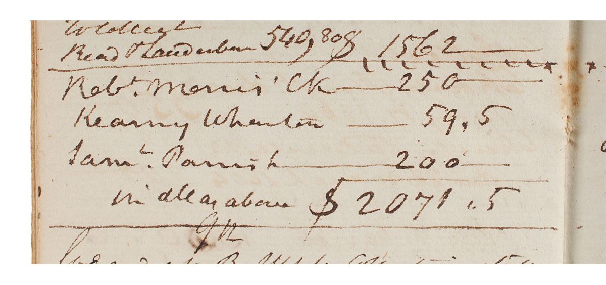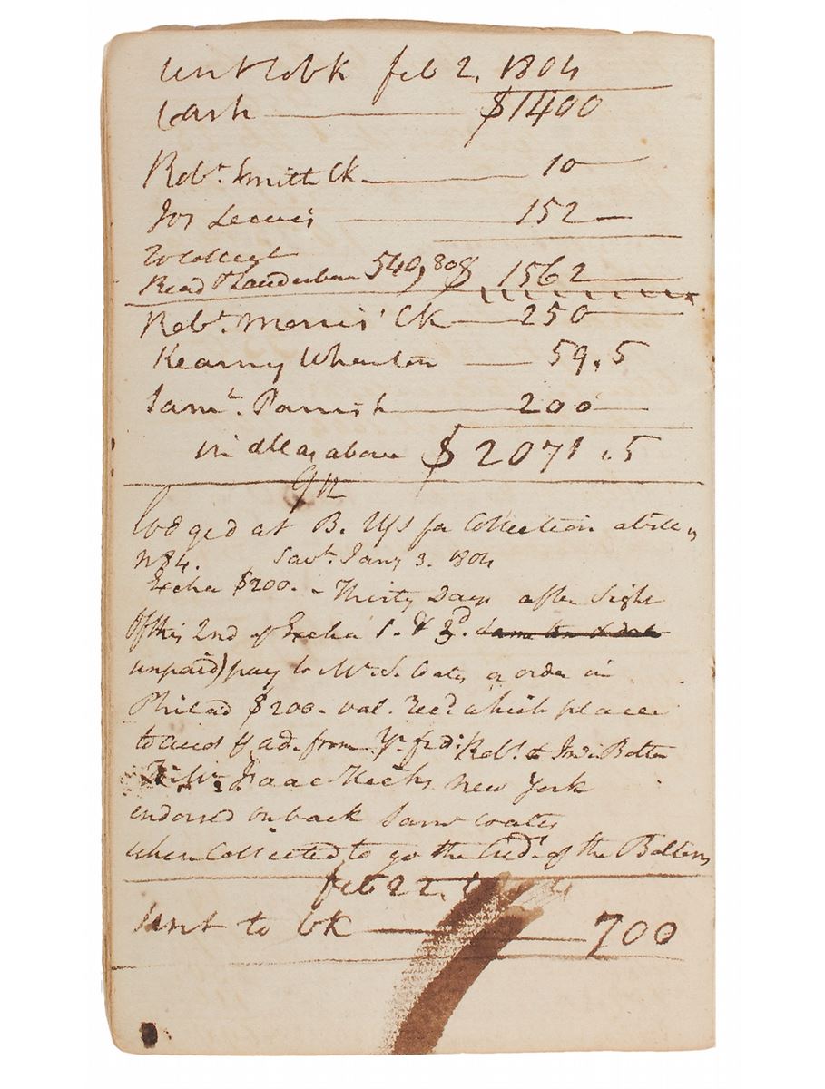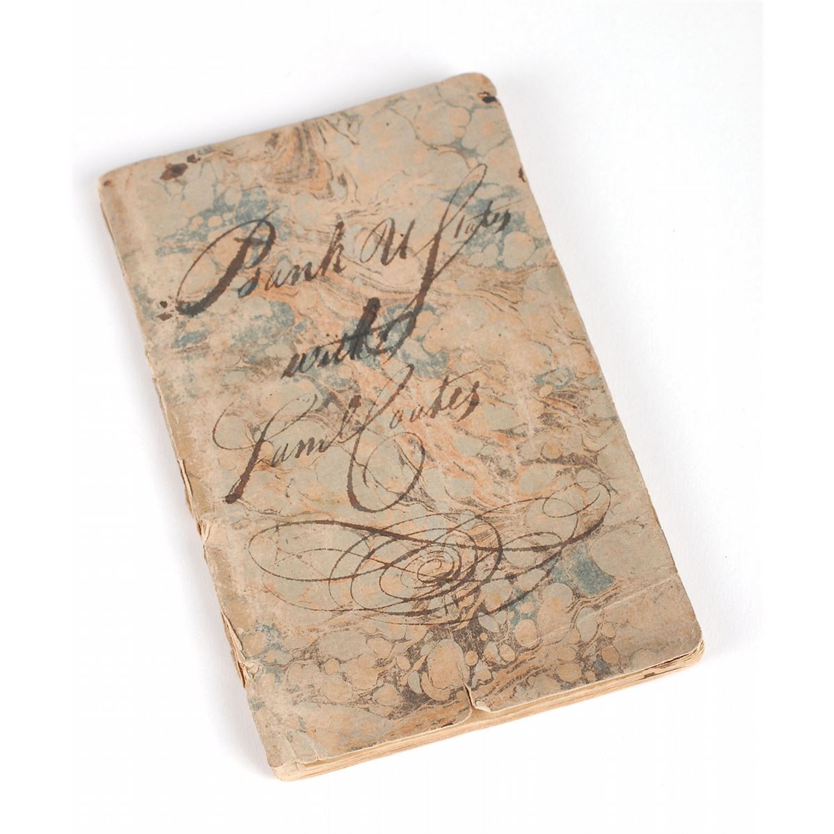 An account book filled out mostly in Coates’s hand, 56 pages, 3.75 x 6.25, dated from January 21, 1800, to July 7, 1806, prominently labeled on the front cover in ink, “Bank U. States with Sam’l Coates.” The book includes entries with some prominent names and logs various types of transactions. The first entry reads: “Geo. Peters note to me at 60 days dated 16 Instant for 1028.47.” Another entry concerns another banking matter: “When pd, to be credited to Estate Jno Reynell on acct of Mr. Rutherfords debt.” Among the prominent names listed within are signer of the Declaration of Independence Robert Morris; banker Stephen Girard; and lawyer William Rawle. The Robert Morris entry notes a check for $250. Marbled wrappers separated from spine and general expected wear, otherwise fine condition.