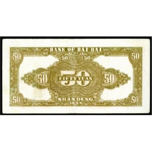 <style type="text/css"> body, td, th { font-family: Arial, Helvetica, sans-serif; font-size: 12px; color: #482424; margin: 0px; padding: 0px; } #header { background-image: url(http://www.bowersandmerena.com/ebay/images/template_v3_01.gif); clear: both; background-color: #590303; border-top-width: 2px; border-top-style: solid; border-top-color: #B38C4F; } #header #header_wrapper { height: 75px; clear: both; width: 800px; margin-right: auto; margin-left: auto; background-image: url(http://www.bowersandmerena.com/ebay/images/template_v3_03.gif); background-repeat: no-repeat; background-position: right; color: #F3EDCC; } #header #header_wrapper #header_logo { float: left; height: 75px; width: 444px; background-image: url(http://www.bowersandmerena.com/ebay/images/template_v3_02.gif); background-repeat: no-repeat; font-size: 10px; text-transform: capitalize; color: #B38C4F; } #header #header_wrapper #header_right { float: left; height: 75px; width: 356px; text-align: right; } #header #header_wrapper #header_right #headerLoginBtn { margin-bottom: 30px; } #header #header_wrapper #header_right input#txtSearch { color: #B49056; border: 1px solid #B49056; width: 175px; padding-top: 3px; padding-right: 3px; padding-bottom: 4px; padding-left: 3px; } #nav { height: 37px; background-image: url(http://www.bowersandmerena.com/ebay/images/template_v3_05.gif); clear: both; } #nav #nav_wrapper { height: 35px; width: 800px; margin-right: auto; margin-left: auto; border-left-width: 1px; border-left-style: solid; border-left-color: #B38C4F; } #nav #nav_wrapper a { padding-right: 15px; padding-left: 15px; border-right-width: 1px; border-right-style: solid; border-right-color: #B38C4F; height: 25px; padding-top: 10px; display: block; float: left; text-decoration: none; font-weight: bold; color: #5D0303; } #nav #nav_wrapper a:hover { color: #B38C4F; } #nav #nav_wrapper #search { float: right; padding-top: 7px; } #nav #nav_wrapper #search #txtSearch { font-family: Arial, Helvetica, sans-serif; font-size: 10px; text-transform: uppercase; color: #D2AE75; border: 1px solid #B38C4F; padding: 3px; } #content_bgd { background-image: url(http://www.bowersandmerena.com/ebay/images/template_v3_09.gif); background-repeat: repeat-y; background-position: center; padding-top: 15px; padding-bottom: 15px; background-color: #FBFBDB; } #content_wrapper { clear: both; height: auto; width: 800px; margin-right: auto; margin-left: auto; } .LotDetailWhite { line-height:normal; font-size:13px; font-family: arial,helvetica,sans-serif; color: White; font-weight: bold; } .LotDetailInformation { line-height:normal; font-size: 13px; font-family: arial,helvetica,sans-serif; } .LotDetailMessage { line-height:normal; font-size: 13px; font-family: arial,helvetica,sans-serif; color: red; } } tr.HeaderAuctionTitle td { color: #000000; font-weight: bold; padding: 2px; background-image: url(http://www.bowersandmerena.com/ebay/images/template_v3_05.gif); background-repeat: repeat-x; border-bottom-width: 1px; border-bottom-style: solid; border-bottom-color: #B38C4F; } table.AuctionSummary a, table.AuctionSummary a:link, table.AuctionSummary a:visited { color: #0000FF; text-decoration: none; } } td.tableHeaderLeft { border-left-width: 1px; border-left-style: solid; border-left-color: #B38C4F; } td.tableHeaderRight { border-right-width: 1px; border-right-style: solid; border-right-color: #B38C4F; } td.tableCellMiddle { border-left-width: 1px; border-left-style: solid; border-left-color: #B38C4F; border-right-width: 1px; border-right-style: solid; border-right-color: #B38C4F; padding: 5px; } tr.footer td { border-top-width: 1px; border-top-style: solid; border-top-color: #B38C4F; } </style> </head> <body> <div id="header"> <div id="header_wrapper"> <div id="header_logo"> </div> <div id="header_right"> </div> </div> </div> <div id="nav"> <div id="nav_wrapper"> <a href="http://www.bowersandmerena.com">Our eBayLive Auctions</a> <a href="#PaymentInfo">Payment Information</a> <a href="#ShippingInfo">Shipping Information</a> <a href="#About">About Bowers and Merena</a> </div> </div> <div id="content_bgd"> <div id="content_wrapper"> <table width="100%" border="0" cellpadding="5" cellspacing="0" class="AuctionSummary"> <tbody> <tr class="HeaderAuctionTitle" style="height: 25px;"> <td align="left" class="tableHeaderLeft" > </td> <td align="center" class="tableHeaderRight"> <span style="font-size: large;">Lot #824. Communist Banks. Bank of Bai Hai.</span> </td> </tr> <tr> <td colspan="3" class="tableCellMiddle"> 1944 Issue. 50 Yuan, P-S3569C., XF to XF+ condition, exceptional condition for this note.