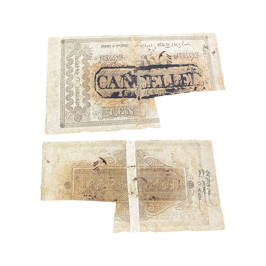 Bank of Bengal, 10 Sicca Rupees, Calcutta, hand signed, dated 21st April 1832, Serial No.: 3449. Obv: Bank of Bengal in ornamented panel on left in Bangla, Persian and Hindi, serial number on either side and denomination on lower left. Rev: BENGAL BANK Gothic and Printed by Perkins & amp; Heath, London in top oval and type of Plate in lower oval within an ornamental panel, J& amp;R 1A.3.3.1.Signature and three corner cut, Cancelled Stamped and Rejoined with paper tape on reverse, Very Fine, Rare.