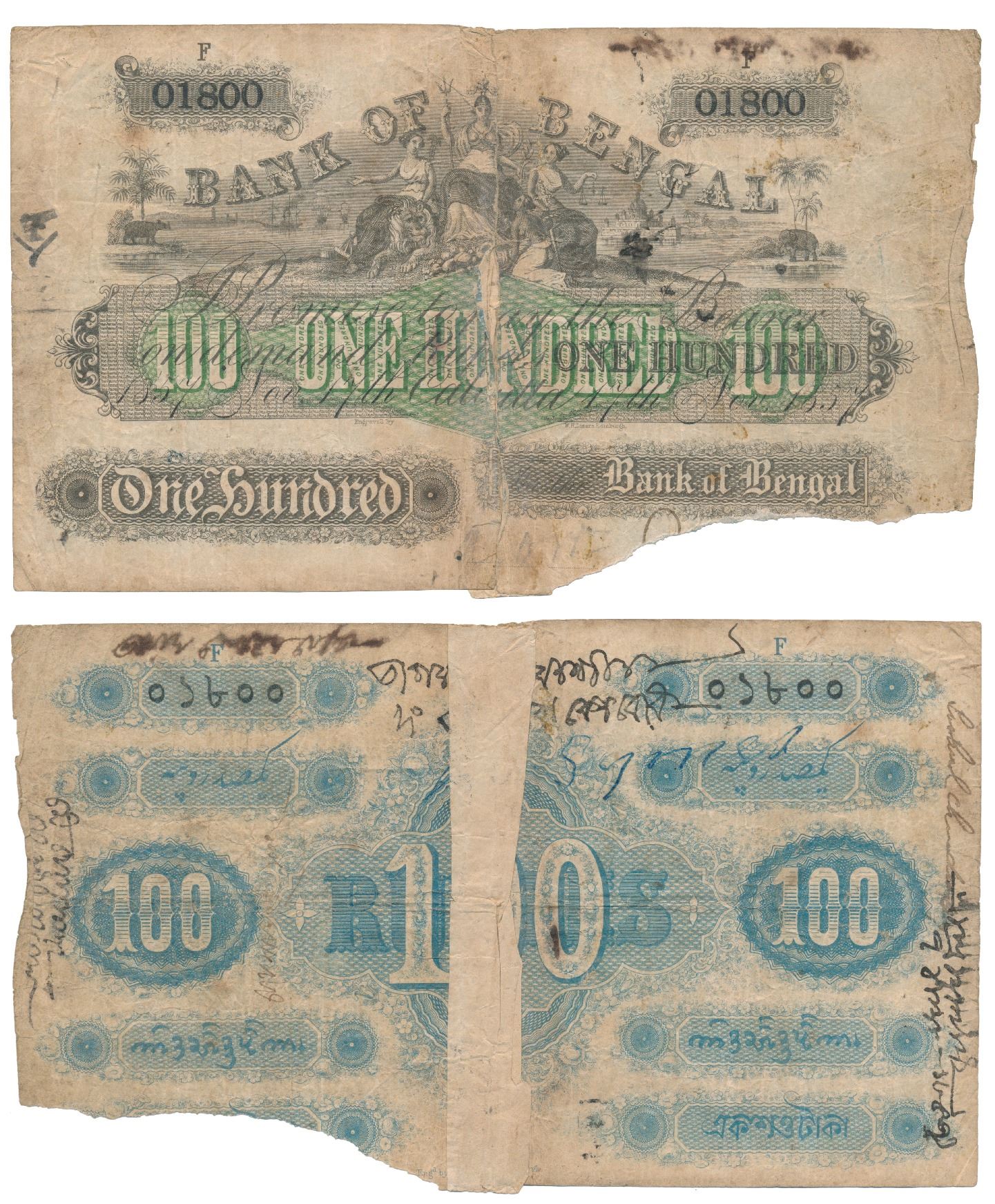 Bank of Bengal, Rupees 10, Calcutta, hand signed, dated 17th November 1857. Serial number placed on top right and left corners in English and in Bengali on the reverse. Denomination written in Bengali, Persian and Devanagari scripts on the reverse. Then newly designed note depicting ‘Britannia’ accompanied by personified Commerce, Trade and Agriculture. Constituent Provinces of the Bengal Presidency identified by a Rhinoceros (for Assam), boat on river Hooghly (for Bengal), tomb of Sher Shah Suri (for Bihar) and Elephant (for the remaining provinces) (J&R 1.3.10.4). The note split in two, About Fine, Very Rare.
