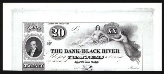Proctorsville, Vermont, 18xx (originally printed in 1830-50's, these are ca.1960-70's), $20, (VT-185-G12), Proof only issue, Modern ÒProprietary ProofÓ, portrait of distinguished man on LL with allegorical women with cornucopia and holding Ò20Ó counter on middle and right, Large margins on top and sides, Black printing with no underprint printed on thin white card, CU to Gem Uncirculated condition. DSH-SHD. (ABN Commemoratives, AIA XI, May 15, 2012)